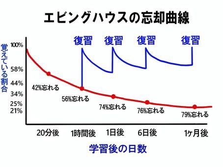 なぜなら、人間の脳は驚くほど物忘れが早いからです。ドイツの心理学者エビングハウスによると、人は学習後20分で42%、1日で74%もの内容を忘れてしまうとされています(いわゆる「忘却曲線」)。テストのために詰め込んだ知識のほとんどは、次の模試までには跡形もなく消え去ってしまうのです。