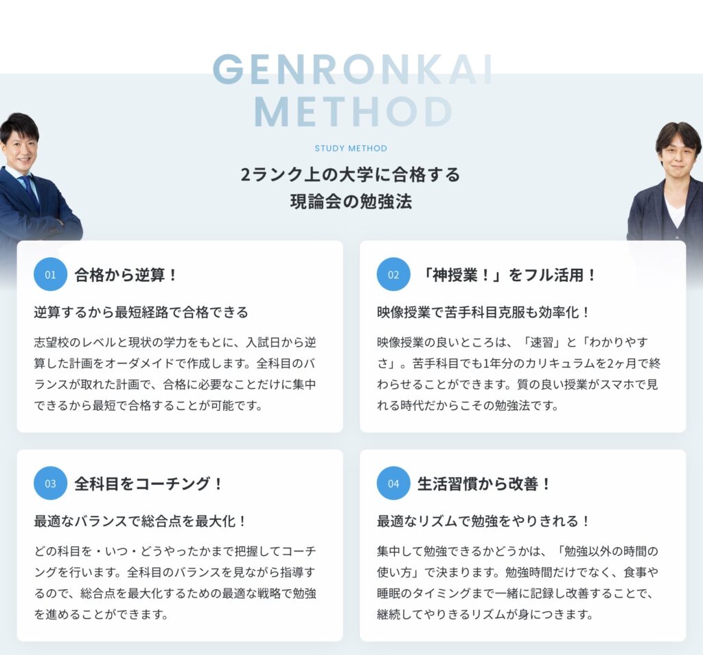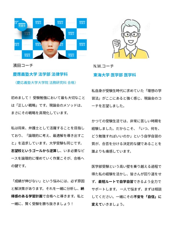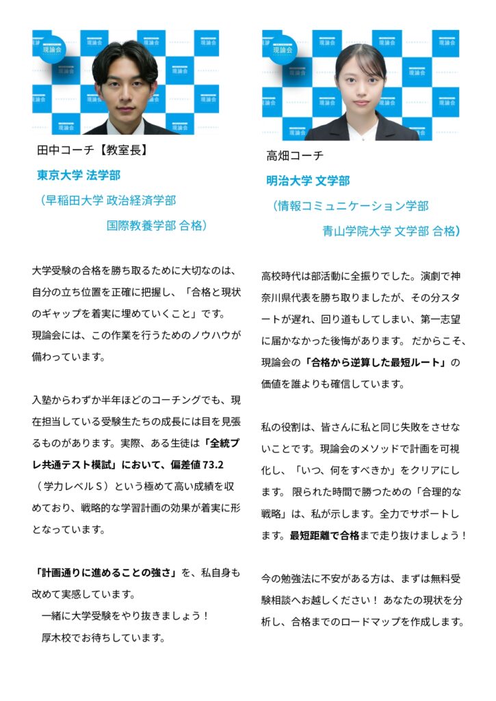 現論会は、映像授業スタディサプリの現役講師が監修する『全国で唯一の大学受験塾』です。自ら問い、改善し続ける「一生モノの自走力」を養います。私たちが大切にするのは合格のその先。大学や社会でも飛躍し続けるための成長の土台を、共に築きましょう!