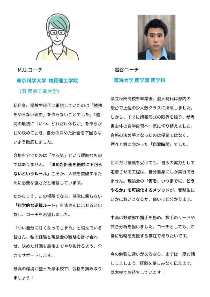 厳しい研修で指導力を磨き続けた凄腕コーチが揃っています。生徒評価アンケートでの満足度は全校舎でもトップクラス。オンラインにはない「対面指導の熱量」で、あなたの合格を最短ルートで導きます!