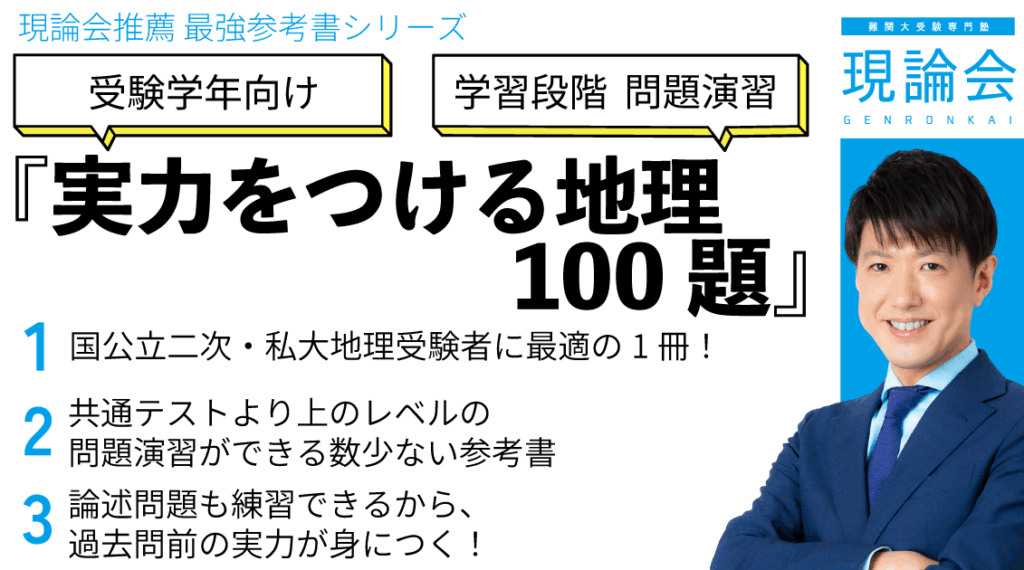 応用力の壁にぶつかる方に、現論会 厚木校がおすすめする最強参考書が、今回ご紹介する『実力をつける地理100題』です。本書は、地理の基礎を固めた後に、早稲田大学、慶應義塾大学、東京大学などの難関大レベルに対応するための力を養う、まさに「実戦力養成の決定版」と言える一冊です。今回は、その特長を解説します。