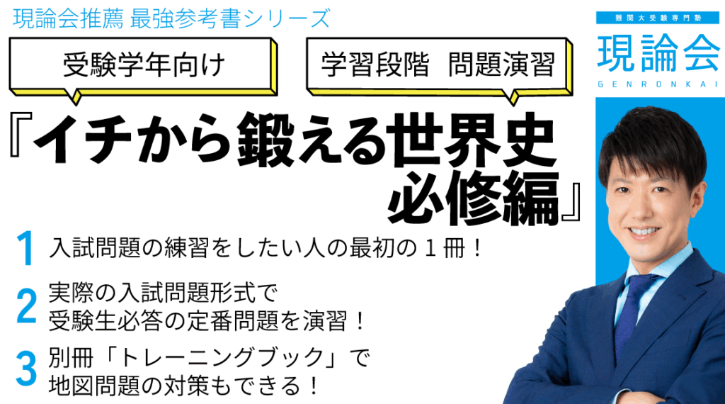 そんな世界史初学者や、基礎を固め直したいと考えている皆さんに、現論会厚木校がおすすめする参考書が、著者・清水 雅博の『イチから鍛える世界史』シリーズです。この一冊は、世界史の学習を「ゼロから」始めるための最強の味方となってくれます。