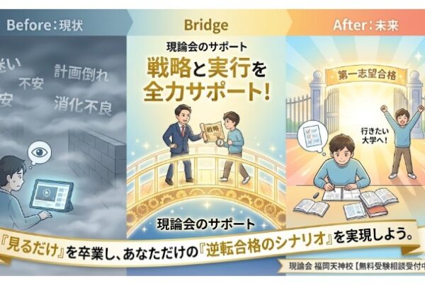 天神エリアには大手予備校が立ち並び、放課後には多くの高校生が行き交います。 「周りのみんなが行っているから」「有名な講師がいるから」という理由で集団授業を選びがちですが、決める前に**「今の自分の生活」**を冷静に振り返 […]