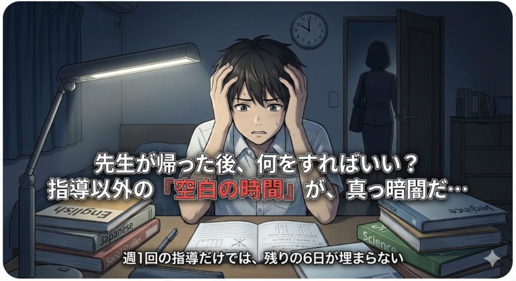 家庭教師の指導は通常、週に1〜2回、数時間程度です。しかし、受験勉強の大部分は「先生がいない時間」の自習です。指導日以外の残りの6日間、何を、どの順番で、どう進めればいいのかまで責任を持って管理してくれる家庭教師は、実はほとんど存在しません。