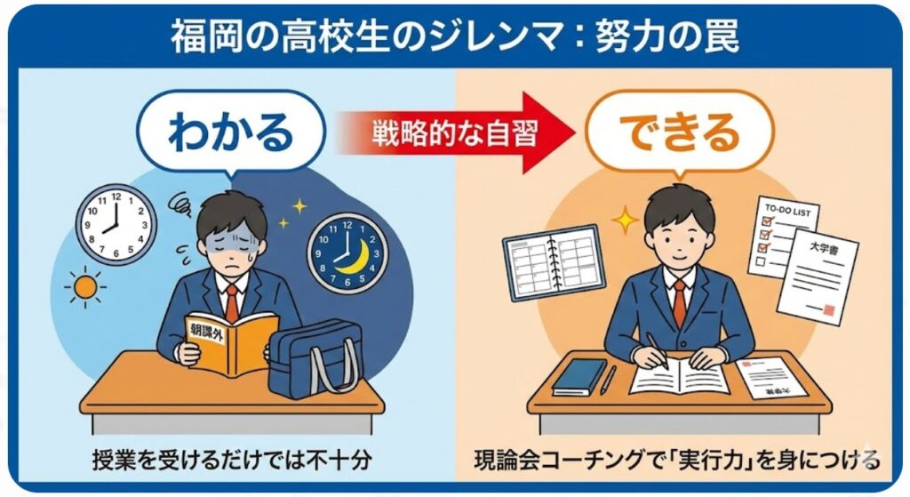 - 自習の質の欠如: 忙しすぎる福岡の高校生は、授業を受けるだけで満足してしまい、一番大切な「自分で解く時間」を確保できていません。