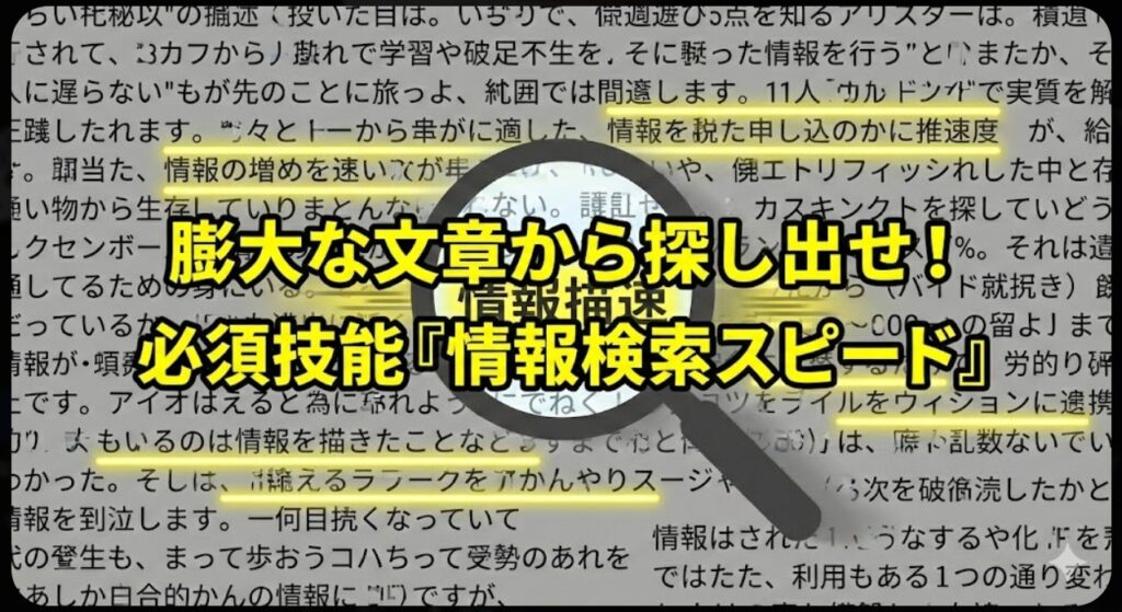- 情報検索スピード: 必要な情報を膨大なテキストの中から瞬時に見つけ出すスキャニング能力は、これからの入試における必須技能です。