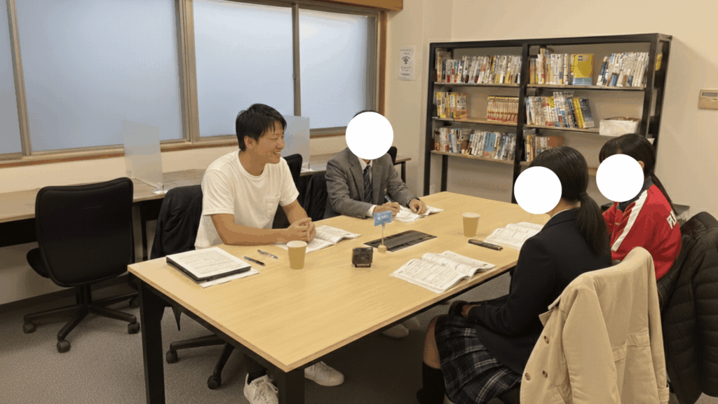 同じテーブルで、他の高校の生徒や、同じように難関大を目指す仲間がコーチと話しています。