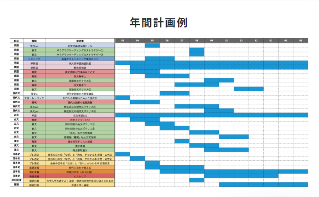 | 6月〜8月 | 実力養成 | 英文解釈と古文文法を固め、偏差値55を突破する。 |