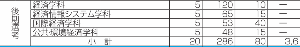 これを見ると国際経済学科の倍率が2023年度は1.6、2025年度は1.3と低めなのが分かります。(2024年度はここだけでなく、全体的に経済学部が人数を絞っていました)