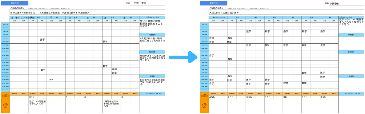 実際に中野さんの学習日誌を拝見すると、学習時間が増えているのが一目瞭然ですね! 記録を通じて自分の勉強スタイルを分析することの重要性が改めてよく分かります。