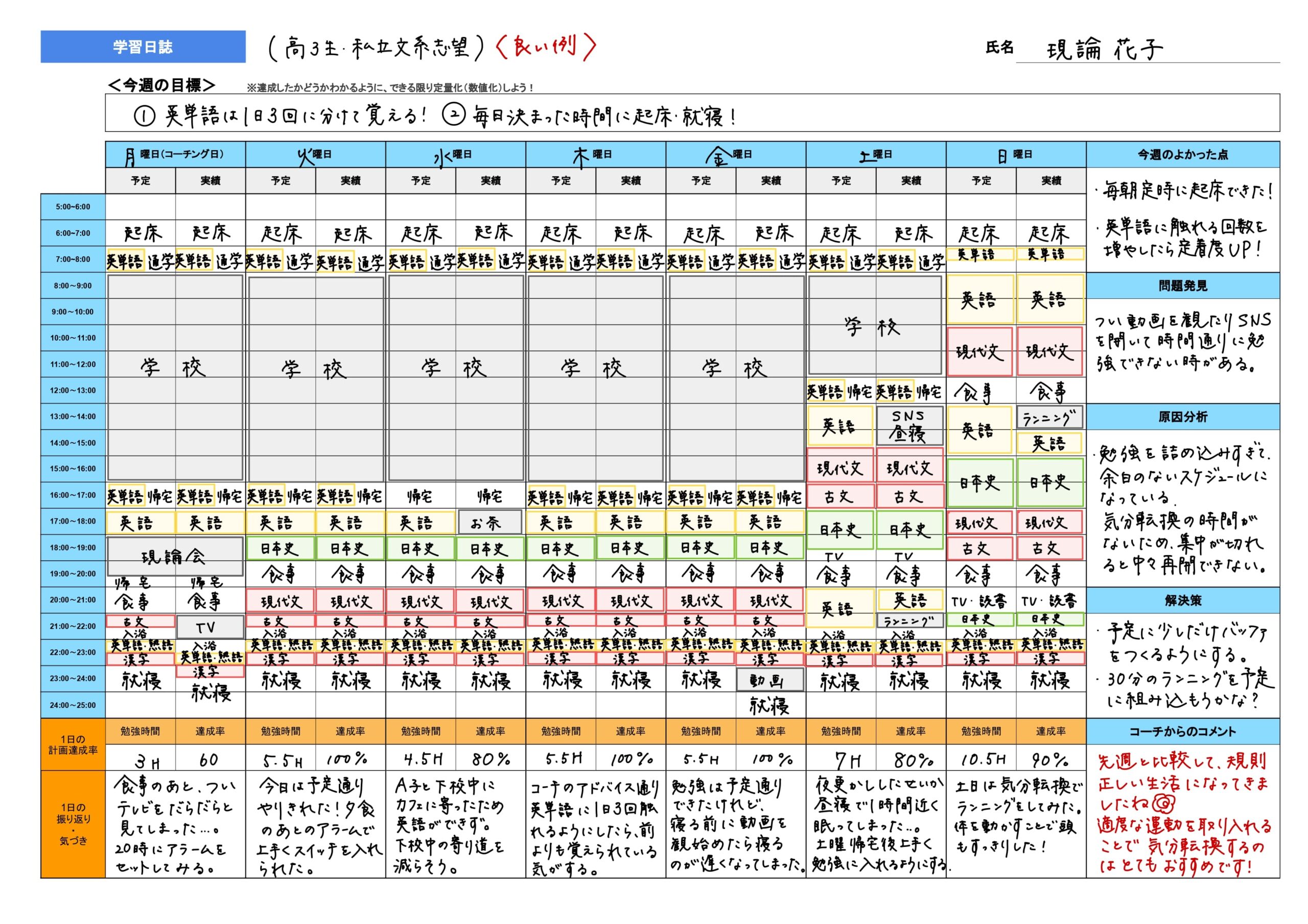 週に一度のコーチングでは、計画の進捗を単にチェックするだけでなく、スケジュール表や確認テスト、生徒からのヒアリングから「なぜ計画通りに進まなかったのか」・「やったはずなのに、確認テストで点数が取れない」といったボトルネックを論理的に分析します。