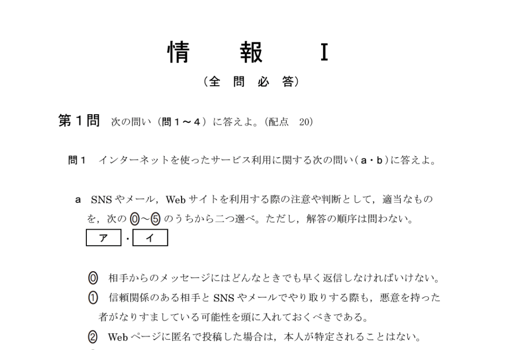 この大問は、情報社会が抱える倫理、法規、セキュリティ、コミュニケーションといった知識分野が中心となります。文章を読み、事例に照らして適切な判断を下す能力が問われます。