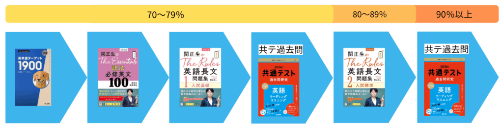 まずは自分の志望校の英語を攻略するための学習に取り組むのが良いですが、このパートでは共通テストの学習を最短で行う学習法を目標得点別に行います。