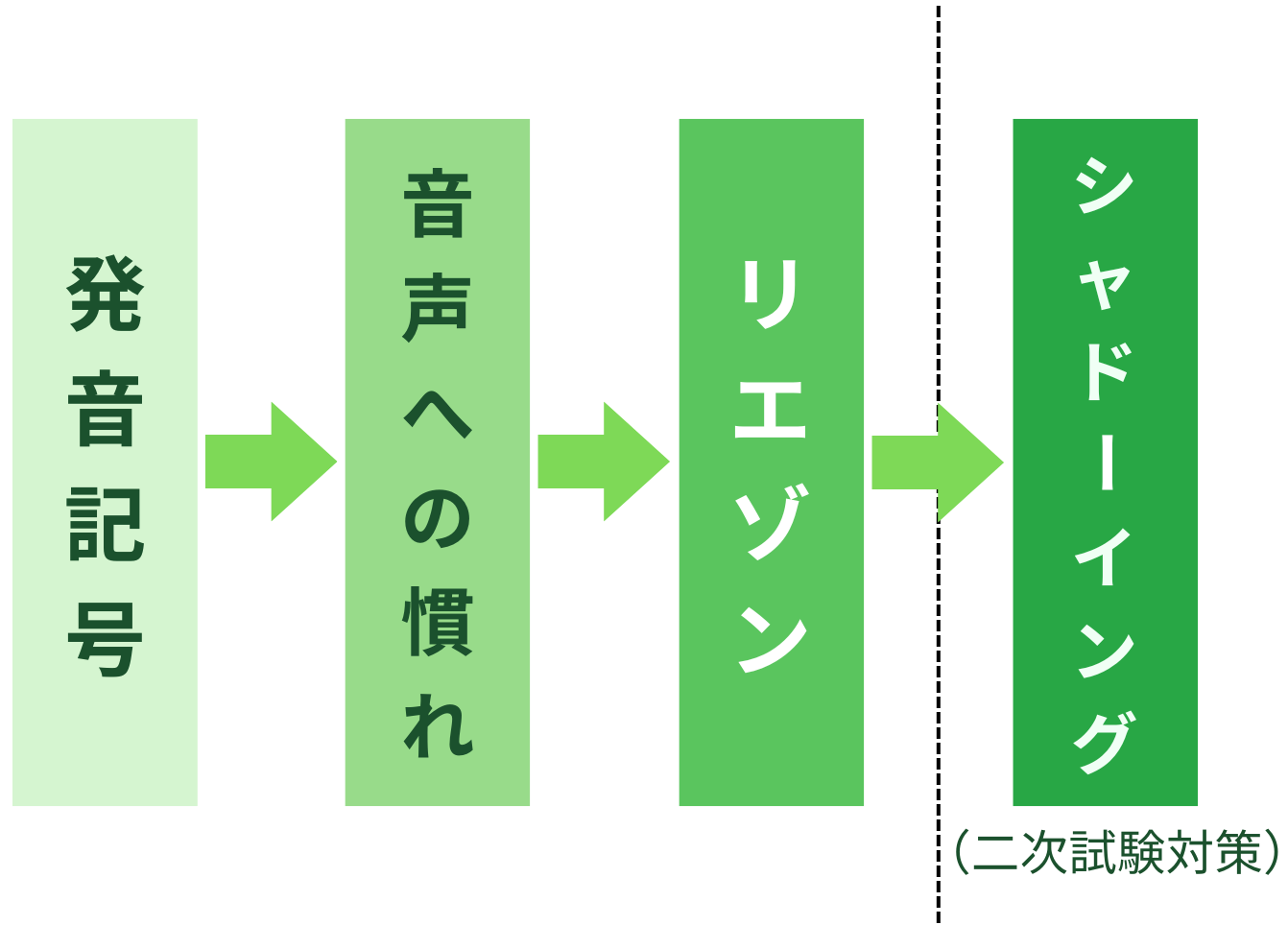 最後に、二次試験に向けてさらにレベルを上げたい場合のみ、シャドーイングを行っていきます。ここまで積み上げてきた音のルールと構文解析力がある状態で初めて、シャドーイングは絶大な効果を発揮します。