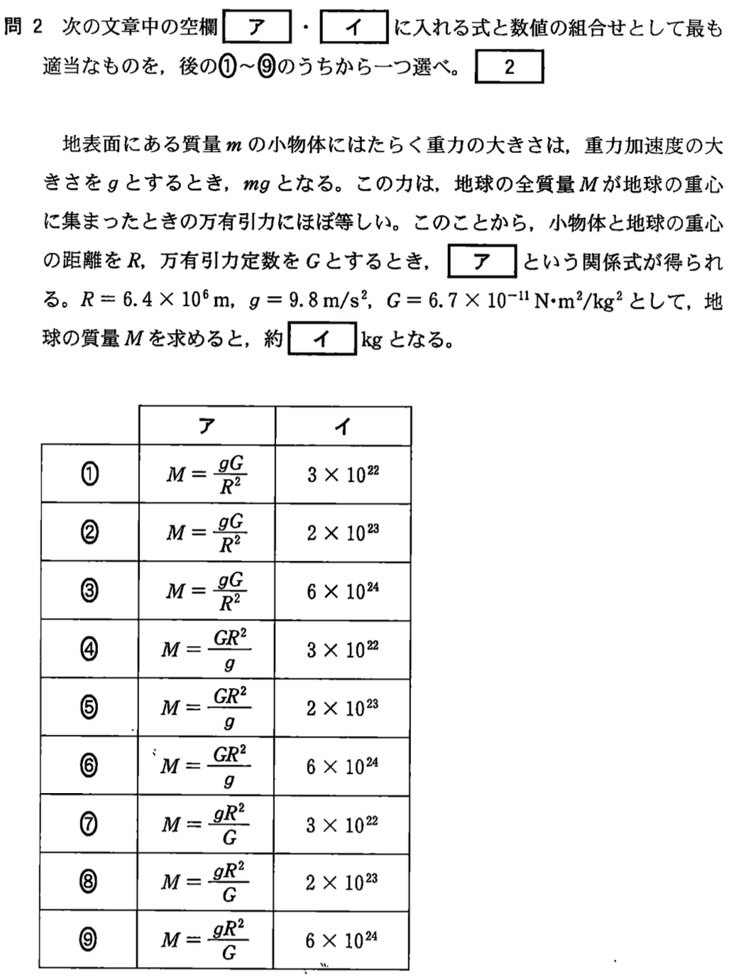 例えば、万有引力に関するこの問題を見てみましょう。 問2の空欄[ ア ]では、地球の質量 M を表す式を選ぶ必要があります。真面目に mg=GR^2Mm​ という等式を立てて M= の形に変形しても解けますが、ここでは次元から正解を絞ったり、物理的な意味による検算のテクニックを紹介します。