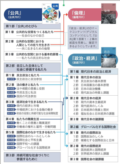 公共のうち、倫理分野は「公共空間の形成」という、高校教科書の第一部にあたります。