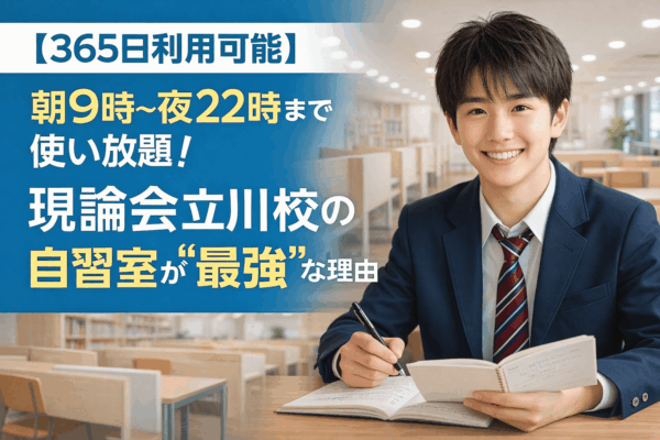 「家では集中できない」「集中できる場所を求めてカフェを転々としている」 そんな悩みを持つ受験生の皆さん、お待たせしました! 現論会立川校の自習室は、365日(年中無休)で9:00〜22:00までフル活用いただけます。 今 […]