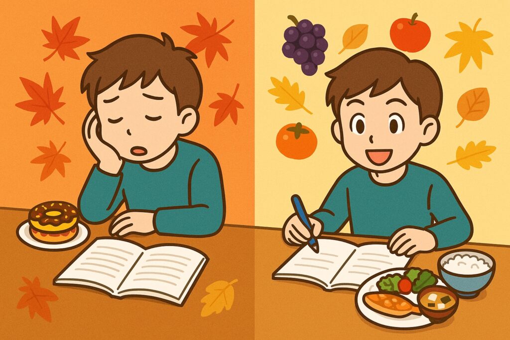 食欲の秋は、勉強の集中力を高めるチャンスでもあります。食事の内容やタイミングを意識するだけで、頭の働きが大きく変わります。しっかり食べつつも工夫して、勉強効率をグッと高めましょう。