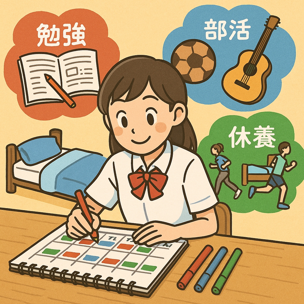 高校1・2年生は、部活と勉強の両立に悩む人が多い時期です。限られた時間の中で効率的に取り組むためには、「3色タスク管理」が有効です。これは、勉強・部活・休養の3つを色分けして見える化する方法です。