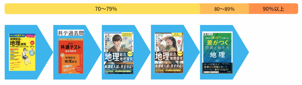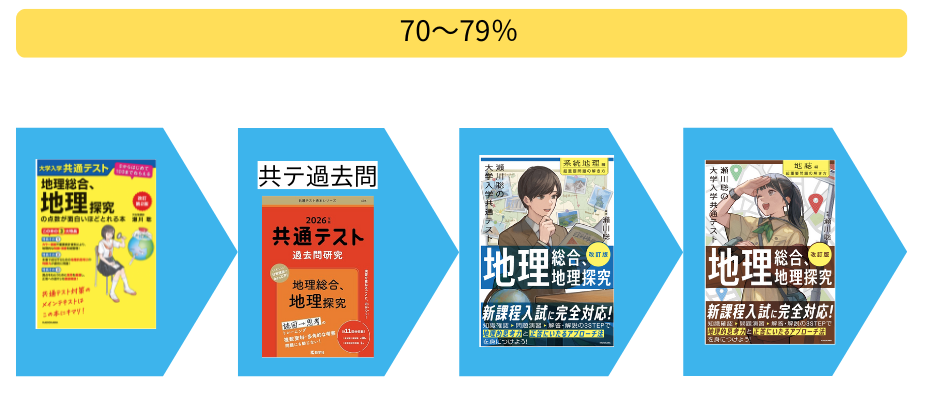 下記の参考書を過去問を軸に取り組みましょう!最初の参考書で地理の全体概要を体系的に学び、そのうえで一度過去問に取り組みましょう。過去問に取り組む意図は問題を把握して、どのような問題が出るかを知ったうえで、問題の解き方を学んでいきましょう。この時の過去問は本格的な演習ではないため、一年分取り組み、しっかりと分析を行うことが大切です。