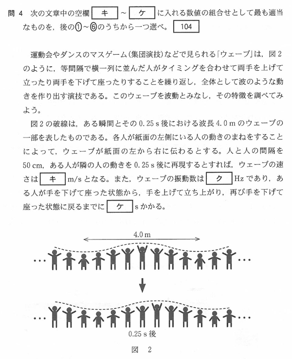 特に問4のウェーブの問題は、日常的な動作を物理的な波動(波長や速さ)としてモデル化する思考力が問われ、共通テストらしさが凝縮されていました。