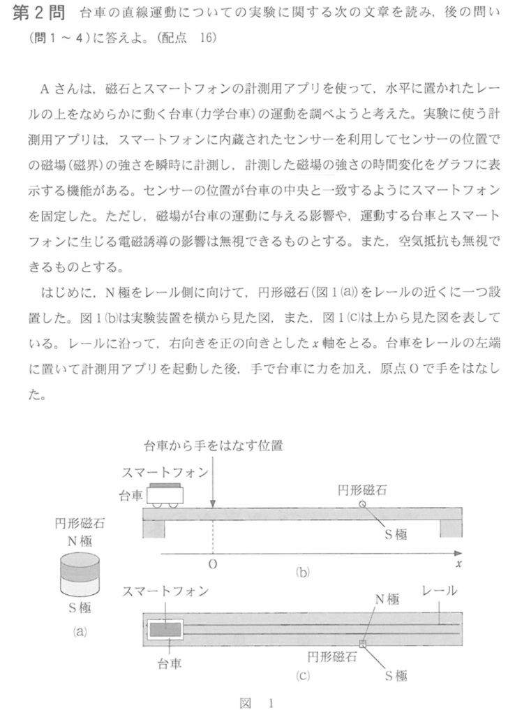 スマートフォンの磁気センサーを利用して、台車が磁石の横を通過する際の磁場の強さの変化から運動を分析する実験問題です。